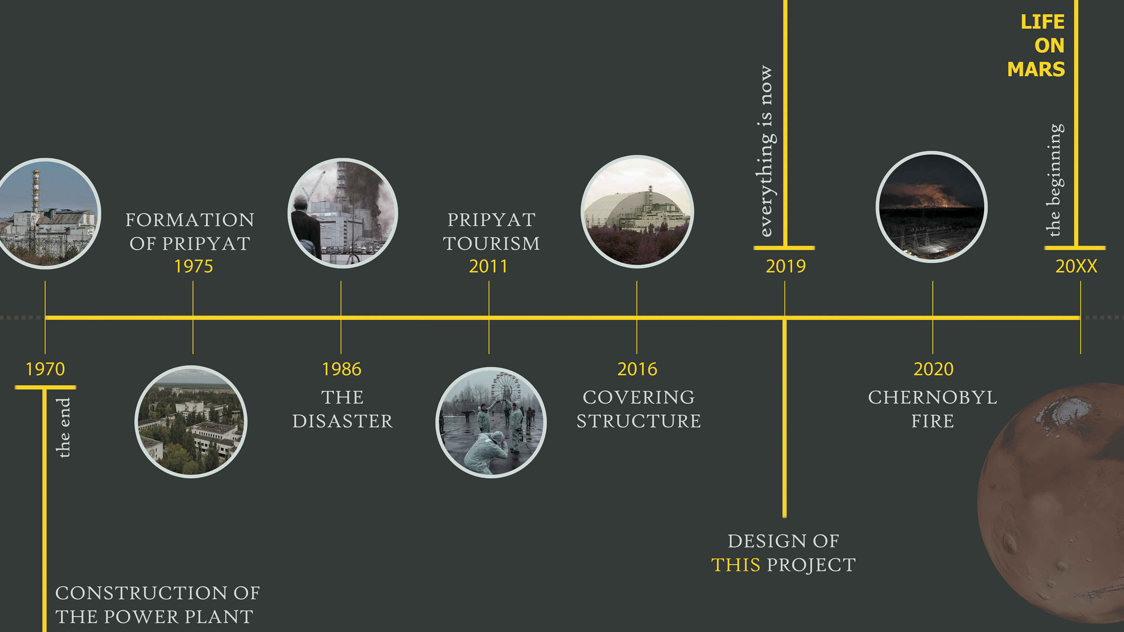 The nuclear disaster that occurred in April 1986 resulted in long-term environmental contamination whose ecological, atmospheric, and spatial consequences are projected to persist for centuries. Following the evacuation of the region, large portions of the territory surrounding the city of Pripyat within the Chernobyl Exclusion Zone remained uninhabited for decades, gradually transforming into an anthropogenically altered yet ecologically active landscape. In this sense, Chernobyl has evolved into a paradigmatic terrain of the Anthropocene, where human-induced environmental transformation has produced extreme ecological conditions that challenge conventional models of habitation. Simultaneously, contemporary scientific discourse has increasingly focused on the possibility of extraterrestrial settlement. One of the most persistent challenges in this regard is the presence of elevated levels of environmental radiation in potential off-world environments such as Mars or the Moon. Within this context, terrestrial radioactive landscapes may be reconsidered not merely as contaminated territories requiring remediation, but as experimental grounds through which adaptive spatial strategies can be developed and tested for future planetary habitation.