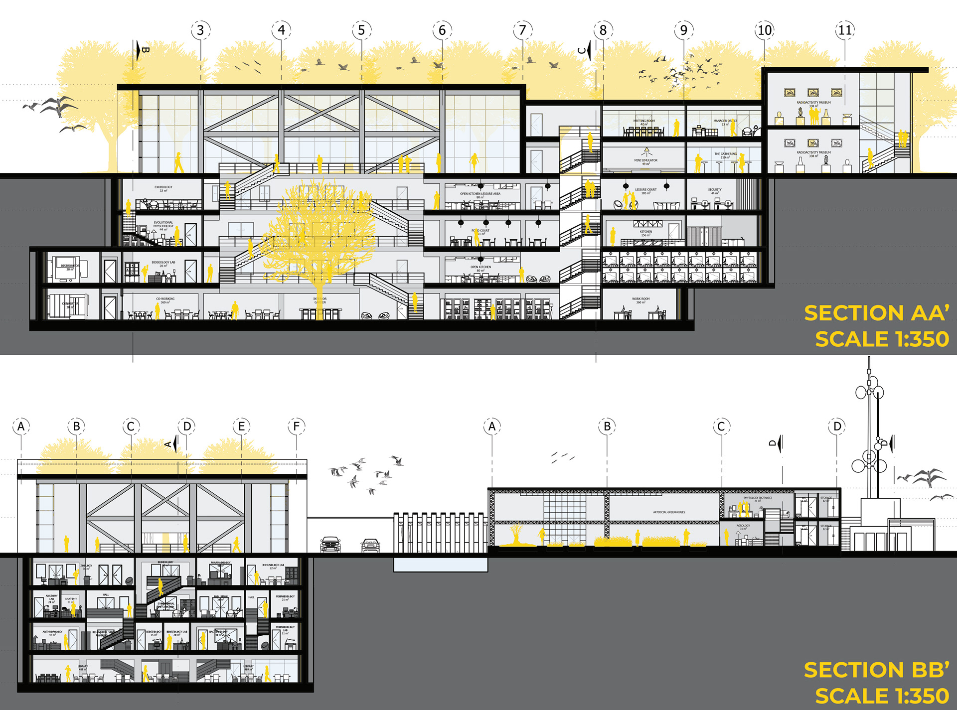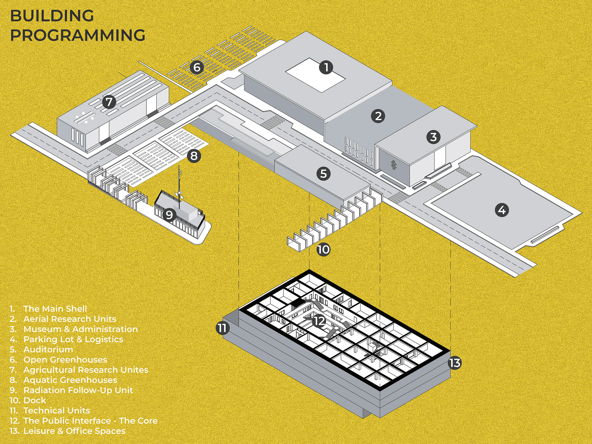 Subterranean laboratory units are embedded within the terrain in order to benefit from the natural shielding properties of earth mass, while selectively elevated above-ground research platforms facilitate observational and experimental studies in direct environmental contact with the radioactive landscape. In this respect, the design operates through a calibrated spatial gradient that mediates varying degrees of exposure between protected interior environments and contaminated exterior conditions.