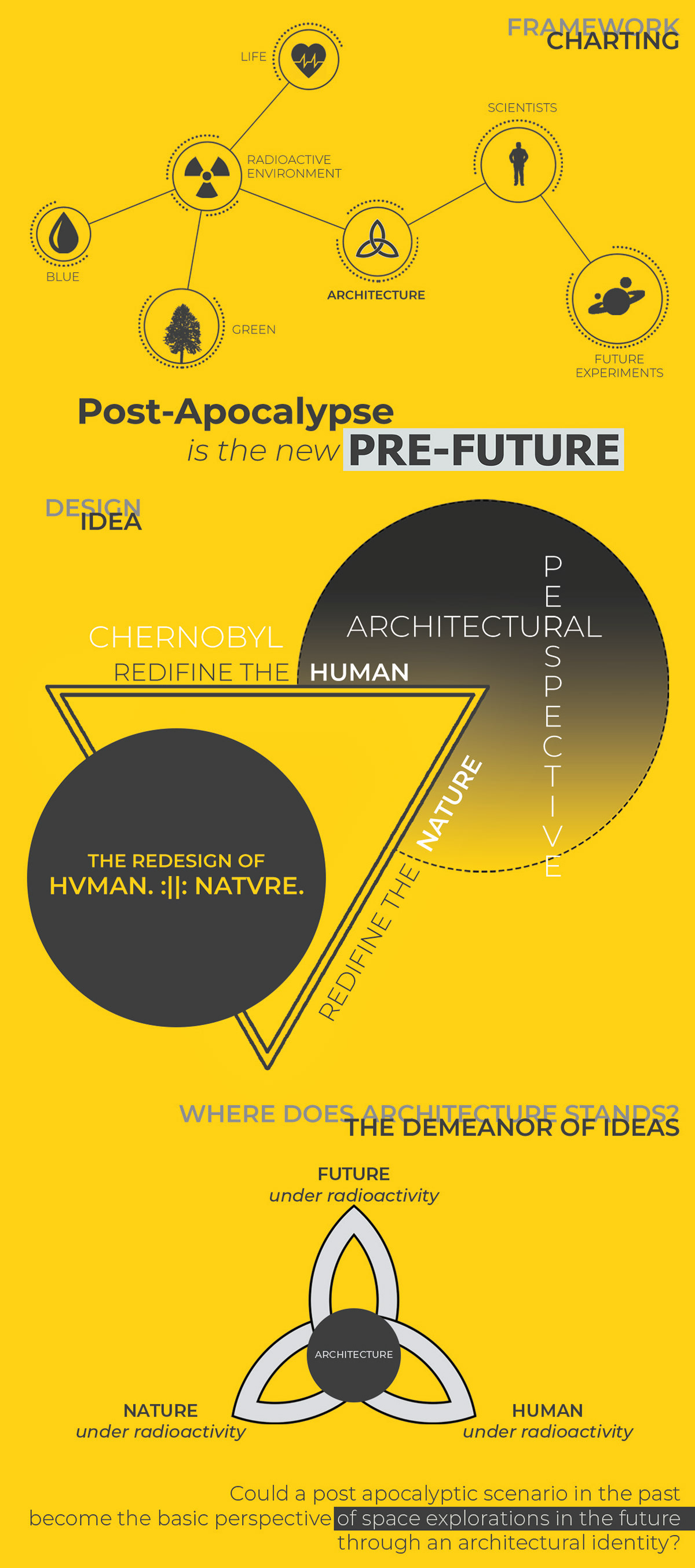 By positioning architecture as a mediating interface, the project proposes a spatial model in which post-apocalyptic environmental conditions are reinterpreted as pre-future testing grounds. In doing so, it establishes an experimental framework for adaptive habitation that may inform future architectural strategies for extraterrestrial environments where radiation constitutes a primary environmental constraint. Ultimately, the proposal advances an architectural allegory of resilience in the Anthropocene: a design approach that does not seek to eliminate environmental extremity, but to inhabit, negotiate, and learn from it as a precursor to future spatial paradigms beyond Earth.