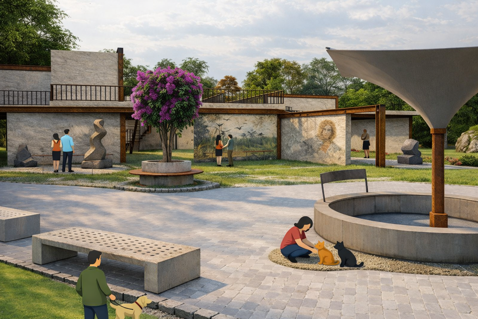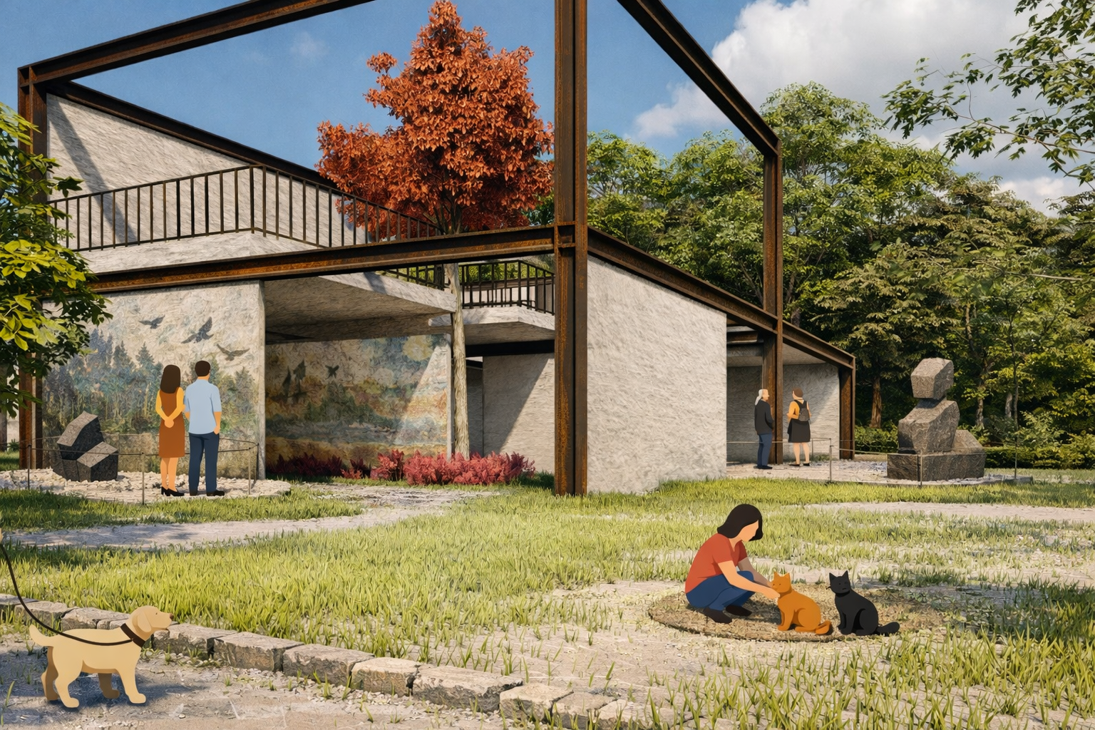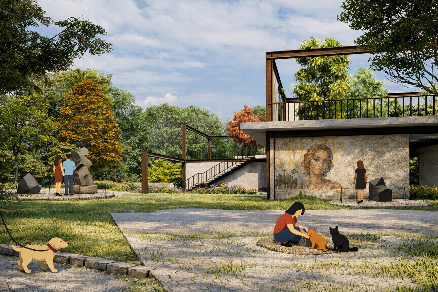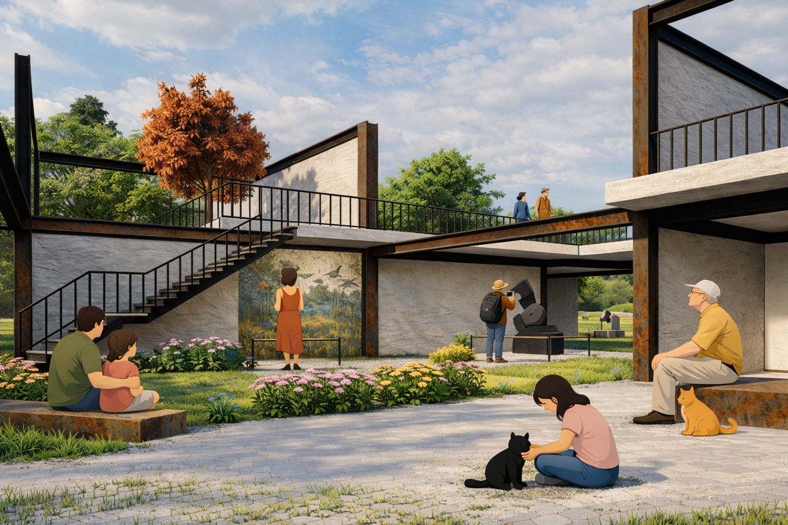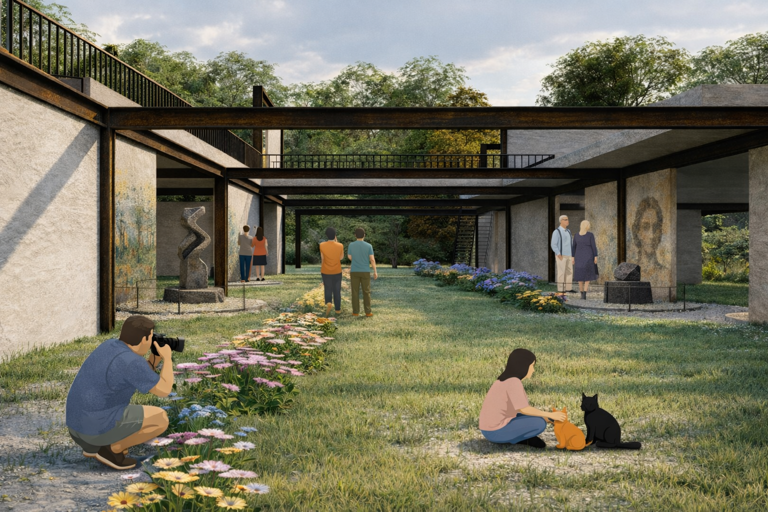 The term “Vivarium”, refers to an enclosure designed for observing living organisms under controlled, semi-natural conditions. The project adopts this terminology in order to conceptualize exhibition space not as an enclosed gallery environment, but as an open spatial system in which natural processes become integral components of curatorial experience. Thus, the Vivarium Open-Air Exhibition proposes an alternative exhibition framework in which the integration of landscape elements mediates the relationship between spatial perception and curated content. Through the controlled manipulation of light, circulation, and vegetation, both two-dimensional and three-dimensional materials are situated within a shared environmental setting. Rather than positioning nature as a passive backdrop to displayed artefacts, the intervention foregrounds the landscape itself as an active exhibition medium. A sequence of interconnected platforms enables users to observe exhibited works, environmental conditions, and one another within a collectively shared spatial field. By enhancing existing open space through environmental integration, the project operates as a performative exhibition ground where perception, movement, and interaction become central components of the curatorial experience.